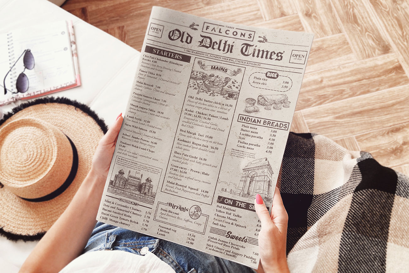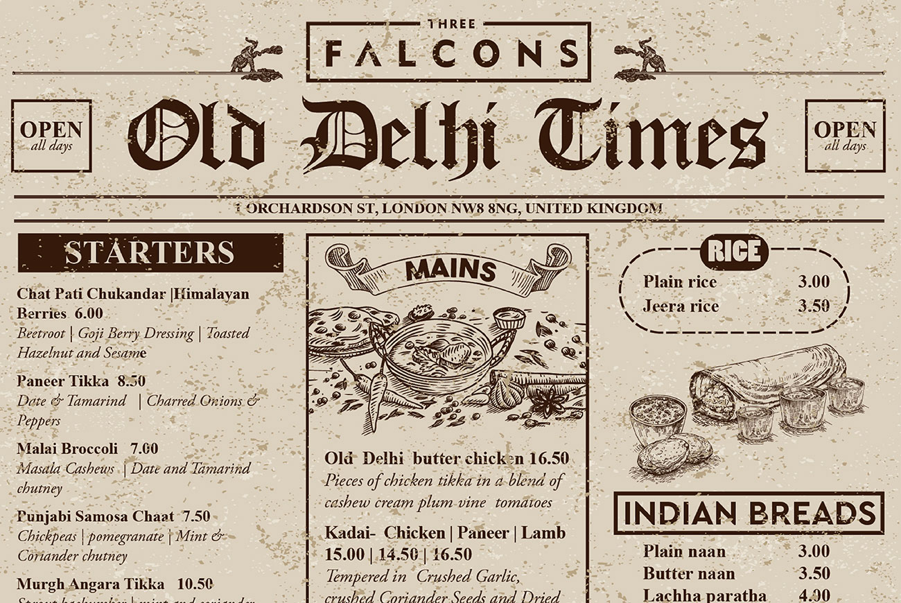 The ‘Old Delhi Times’ menu at Three Falcons beautifully blends tradition and designed like a vintage newspaper to capture the true essence of India. From flavorful starters to iconic mains like Old Delhi butter chicken, the menu not only delights the palate but also immerses guests in a nostalgic dining experience that celebrates rich Indian heritage in the heart of London.